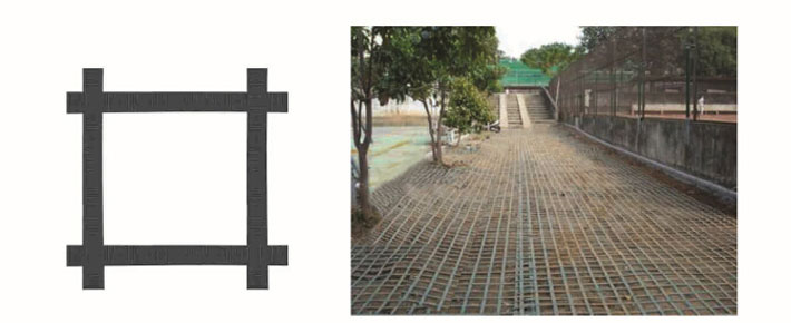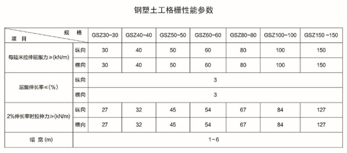 鋼塑復(fù)合土工格柵是用聚丙烯、聚氯乙烯等高分子聚合物經(jīng)熱塑或模壓而成的二維網(wǎng)格狀或具有一定高度的三維立體網(wǎng)格屏柵。由于塑料土工格柵在制造中聚合物的高分子會隨加熱延伸過程而重新排列定向,加強了分子鏈間的聯(lián)結(jié)力,達(dá)到了提高其強度的目的。其延伸率只有原板材的10%~15%。如果在土工格柵中加入炭黑等抗老化材料,可使其具有較好的耐酸、耐堿、耐腐蝕和抗老化等耐久性能。